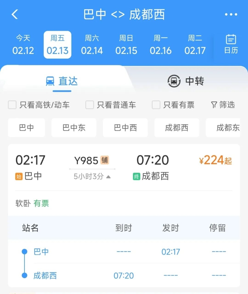 成都东—巴中东方向:C4034次列车成都东23:23开,次日02:22抵达巴中东,2月12日至15日每日开行1趟;