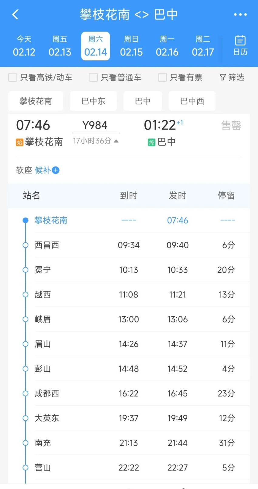 巴中东—成都东方向:C4035次列车巴中东03:00开,06:02抵达成都东,06:20抵达成都南,2月12日至15日每日开行1趟。