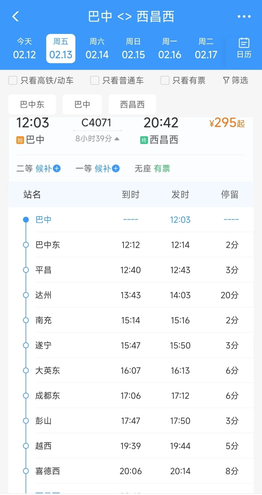 巴中东—重庆西方向:C4065次列车巴中东02:05开,05:08抵达重庆西,2月12日至15日,除14日外每日开行1趟;